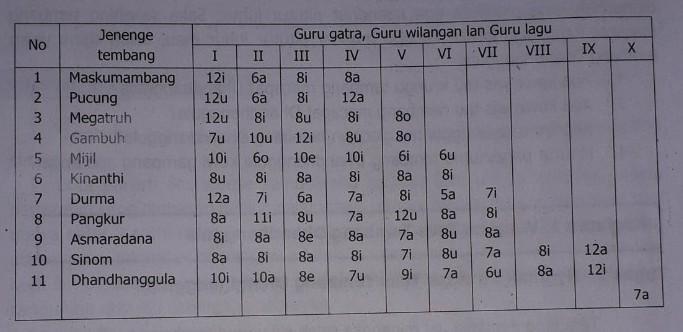 Contoh tembang macapat beserta dengan guru gatra, guru wilangan, guru lagu dan artinya. Guru lagu yaiku tibaning swara ing saben pungkasaning gatra. Guru gatra, guru wilangan, lan guru lagu ing tembang macapat. Guru wilangan adalah jumlah suku kata dalam setiap baris tembang macapat. Guru wilangan yaiku cacahing wanda ing saben sagatracacah guru gatra tembang pangkur ana 7.